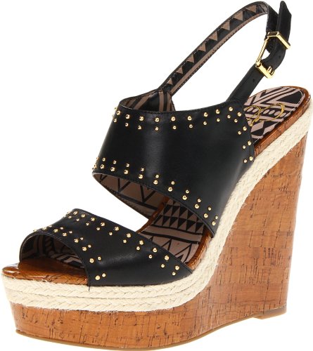 Get ready for the compliments in the utterly cute Geno by Jessica Simpson. A black leather is adorned with flashy studs at the vamp and upper. An adjustable heel strap, 5 1/2 inch cork wedge and 1 1/2 inch platform is completed with an espadrille trim.