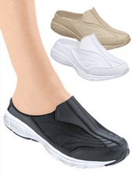 Lightweight sneaker clog has a cushioned, fully lined urethane upper with genuine leather trim. Perfect for all-day walking comfort. Cushioned insole and flexible rubber sole. 1" heel. Imported. Women's whole sizes only, half sizes order next larger size.