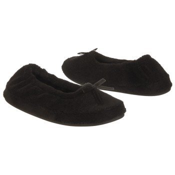 This ballerina slipper is perfect for wearing around the housePlush terrycloth fabric upper with stretchy topline and bow accentTerrycloth lining and footbed coverThickly padded foam footbedIndoor/outdoor rubber-like soleMachine washableAvailable in whole sizes only, half sizes please order the next size up