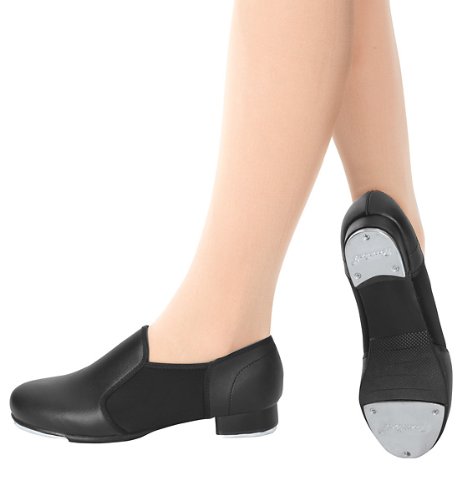 Economy slip-on tap shoe featuring innovative neoprene arch inserts is easy to slip on and off and accommodates various foot widths while still providing excellent fit. Other features include a man-made leather upper, molded taps with sound board and a non-skid rubber patch.