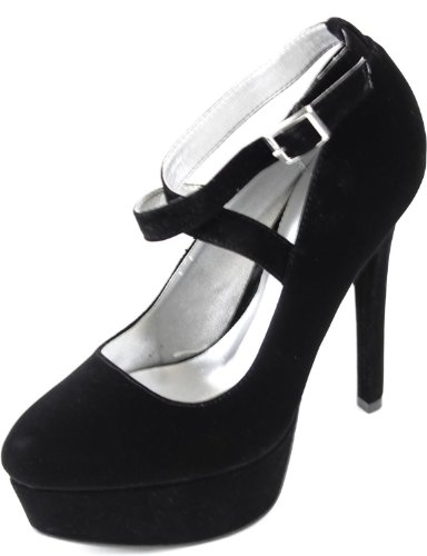 Material: Man Made Velvet Material. Brand: Qupid Heel Height: 5.5 inches Heel, 1.75 inch platform (Approx) Product Code: Marquise-09 Black Velvet Must have for your perfect skinny jeans, or cocktail dress. Round almond close toe front, lightly padded insole for comfort. Mary Jane style ankle cross straps. Velvet material on stiletto back heel.