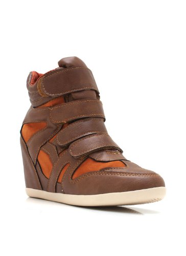 Vegan leather wedge sneakers. These sneakers have a slightly padded tongue, four adjustable straps stretching across the arch (all with velcro closures), and stitched accents. Wedge height: 3.5 inches. Finished with a slightly padded vegan leather insole. Man made materials. Imported.