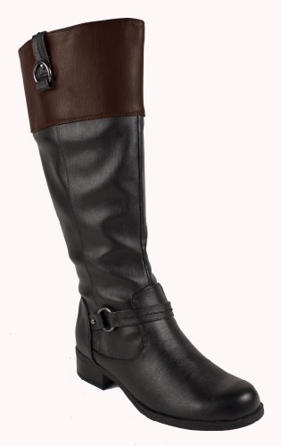 Special Price! for Sam! By Soda Equestrian Knee-high Riding Flat Boots with Buckle Straps in Two-tone, black and brown faux leather, 5.5 M With Special Pomotions Fast Shipping