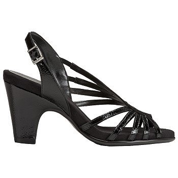 Get a show-stopping look with the Aerosoles Fresco sandal. This distinctive women's slingback dress shoe features a shiny, patent leather upper in a strappy silhouette, with hidden elastic goring on the curvaceous straps and an adjustable buckle slingback strap for a personalized fit. A faux leather lining and sockliner help manage moisture, while a cushioned footbed eases impact stresses. Constructed with comfort and flexibility in mind, the Aerosoles Fresco dress sandal is finished with a durable, traction rubber sole.