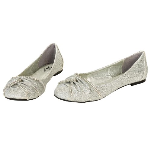 Sparkle and shine in this stunning ballet flat. This flat features a glitter fabric upper with a crystal embellished rhinestone bow for a flashy step. A manmade sole ensures a comfortable and fun stride wherever you go!