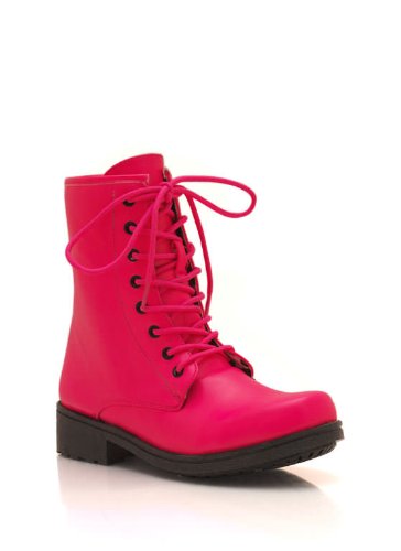 Mid-rise combat boots with faux leather upper, a stacked heel, and a hidden side zipper. Neon color may vary. Shaft height: 6.5 inches. Heel height: 1.5 inches. Circumference of opening: 10 inches. Finished with a slightly padded faux leather insole. Measurements are for a size 5.5. Man made materials. Imported.